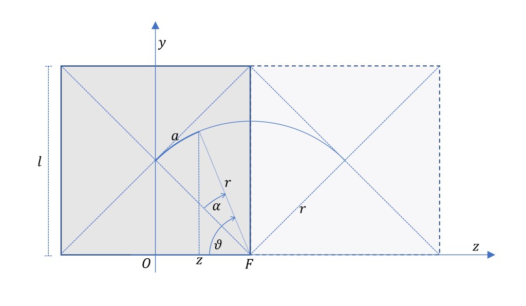 In the previous drawing a cube whose side is equal to 𝑙 is represented on the left and to its right the same cube after having undergone a rotation of 90° clockwise along its fulcrum 𝐹. The position of a parametric cube, in C4D, coincides with the center of the square in the figure. When the cube rotates around 𝐹 by 90°, the center describes an arc of circumference whose radius is 𝑟.